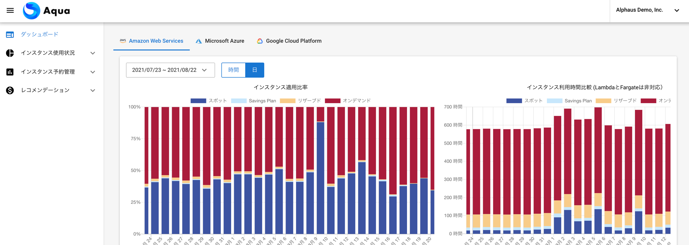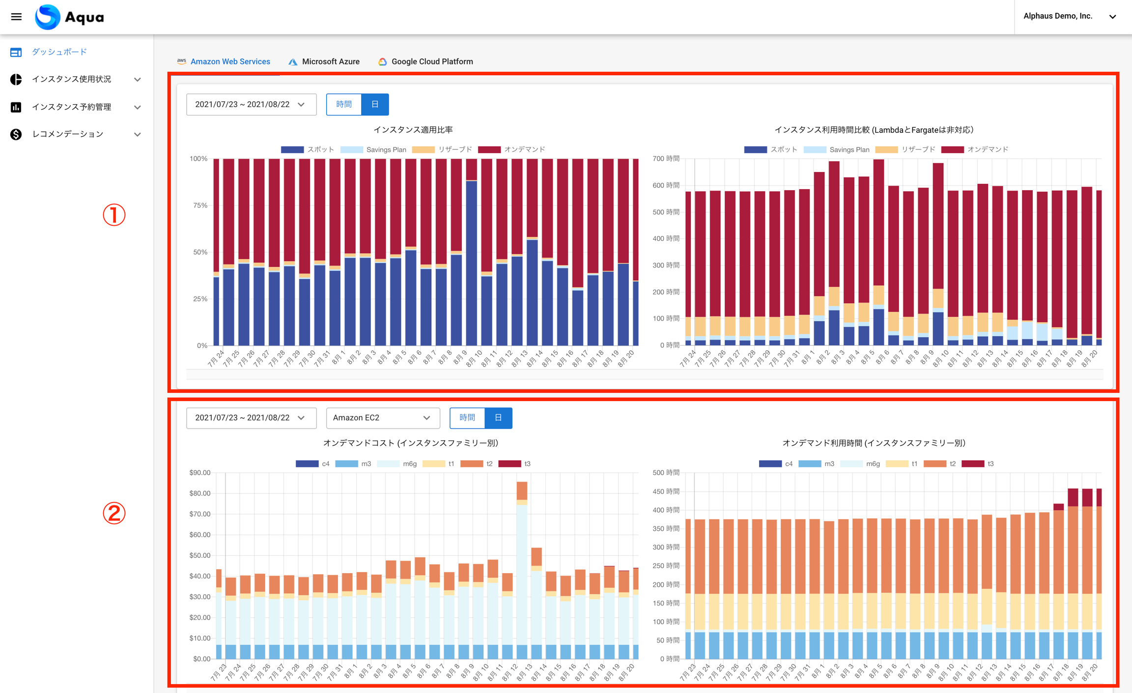 クラウドベンダー純正ツールでは複数アカウントの一括管理や一つの画面でオンデマンド率やオンデマンド部分の詳細について可視化することができませんが、Aquaではそれを可能にします。
